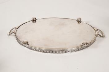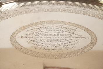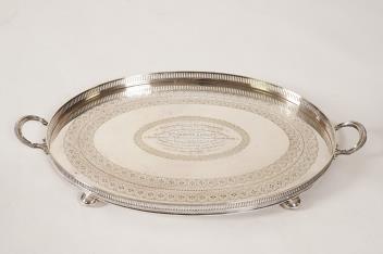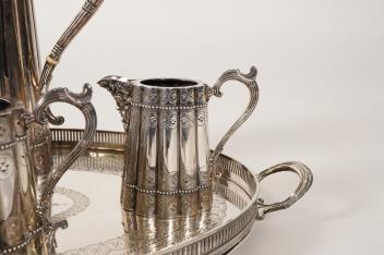 A late Victorian five piece silver tea and coffee service, all pieces with makers marks for John Edward Bingham and Walker & Hall, comprising an oval two handled tray with pierced gallery, bun feet and engraved inscription, teapot, coffee pot, cream jug and sugar bowl, pf lobed tapering design, Sheffield, 1890/1891, 131.6oz, with ivory insulators and ivory knop. CITES Submission reference