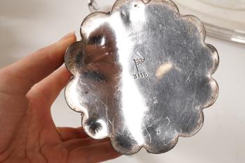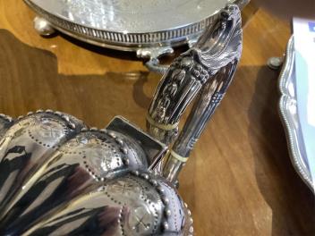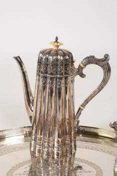 Minor surface scratches to all pieces, commensurate with age and some use. Possible old repair to the top of the handle on the teapot?? Hallmarks clear. Probable old small solder repair to the base of the coffee pot.