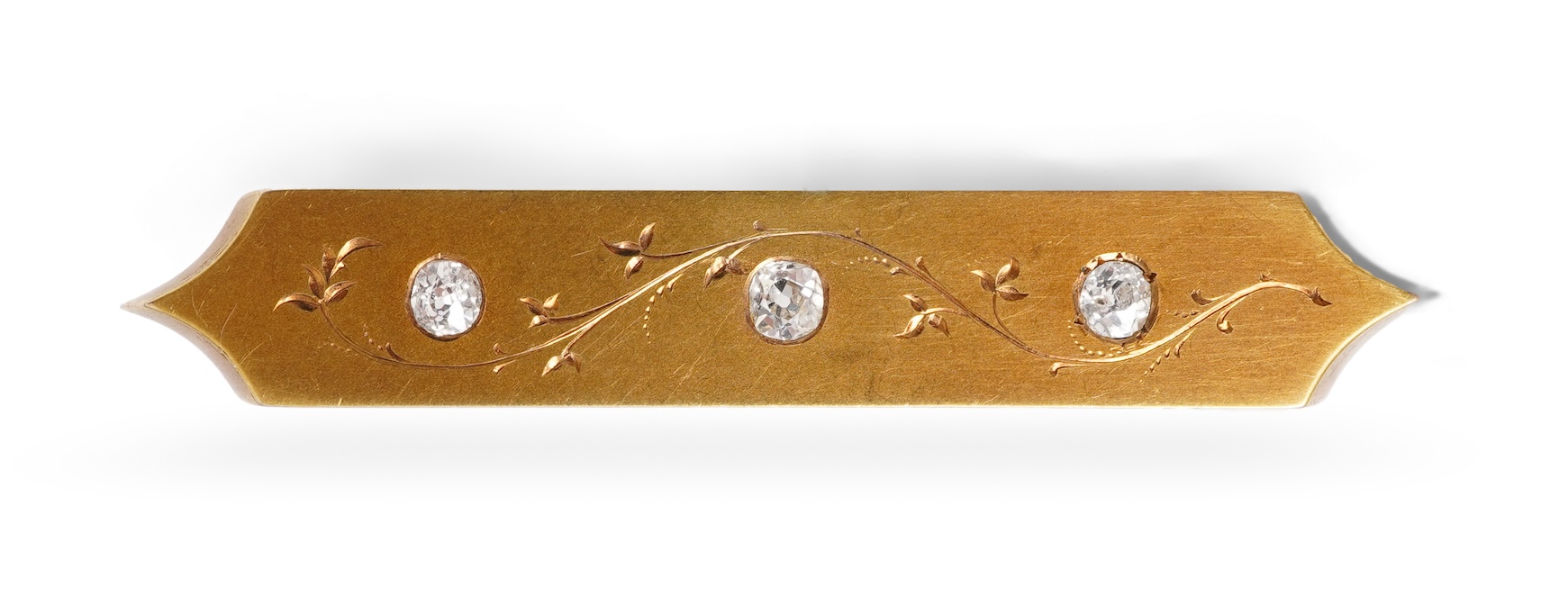 A late Victorian gold and diamond brooch, late 19th century, designed as a panel with pointed ends, engraved with a foliate vine weaving between three cushion-shaped diamonds totalling approximately 0.50 carats, mounted in gold, length 6.4cm, indistinct assay mark, gross weight approximately 6 grams