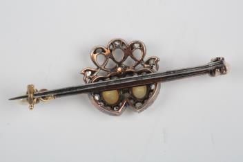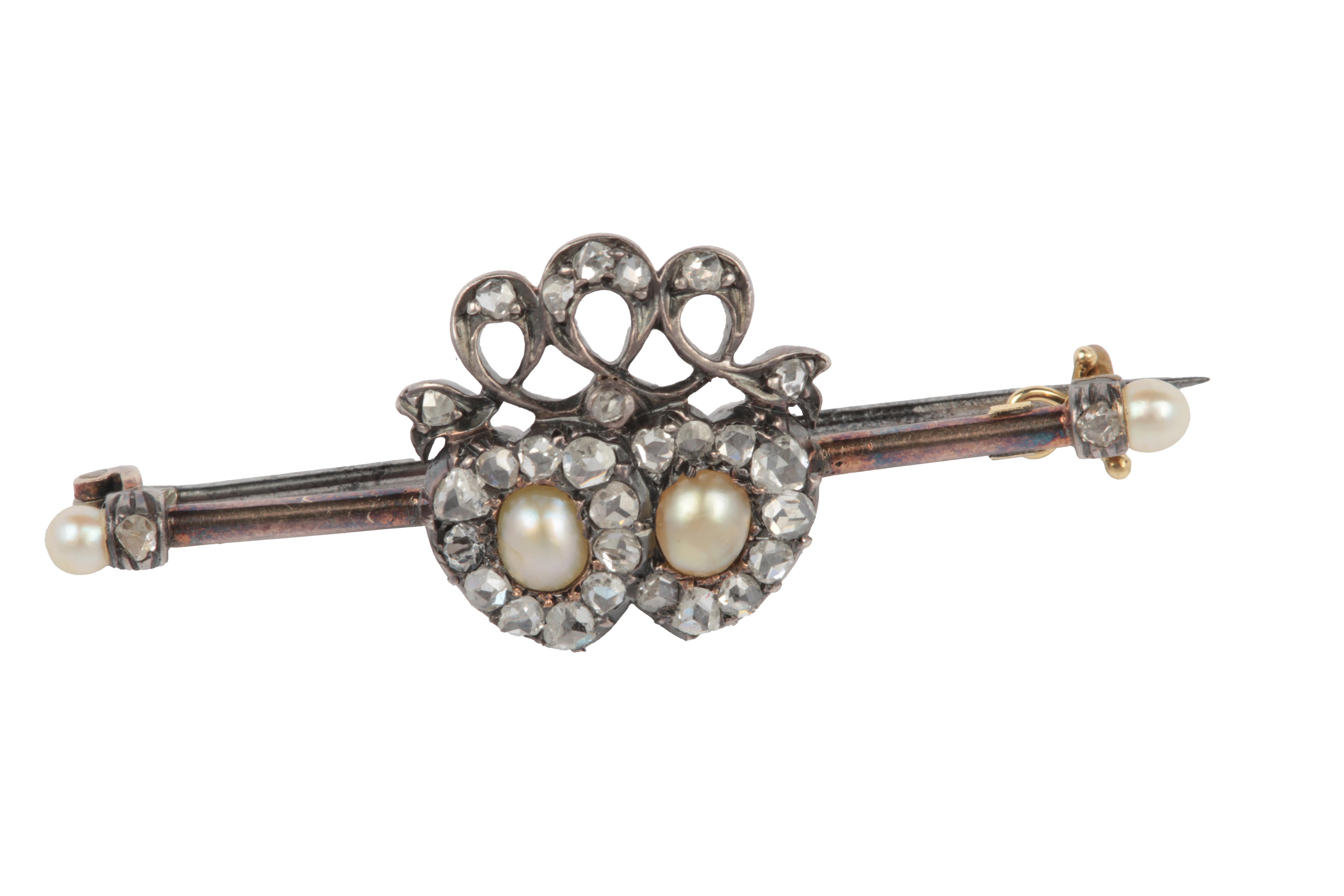 A late Victorian pearl and diamond brooch, designed as two hearts beneath a ribbon scroll, mounted on a bar brooch, set with split and seed pearls and rose-cut diamonds, in silver and gold, length 4.2cm, pearls untested, gross weight approximately 4 grams, fitted case stamped WJ Curroll
