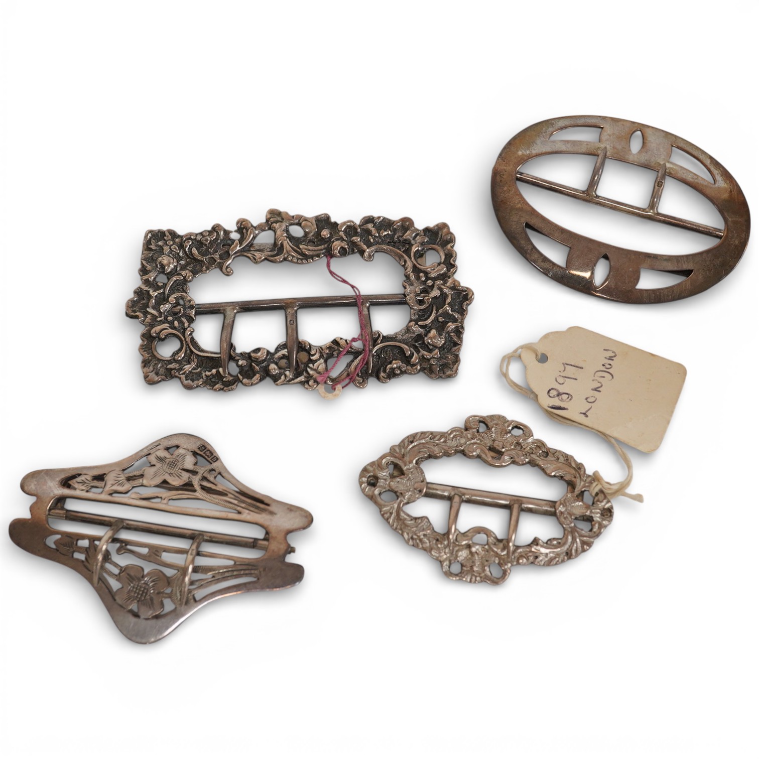 A late Victorian pierced silver belt buckle by Henry Matthews, Birmingham, 1894, 82mm, one other similar smaller buckle, Birmingham, 1895 and two early 20th century silver belt buckles.