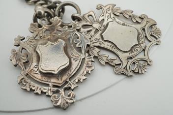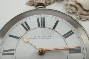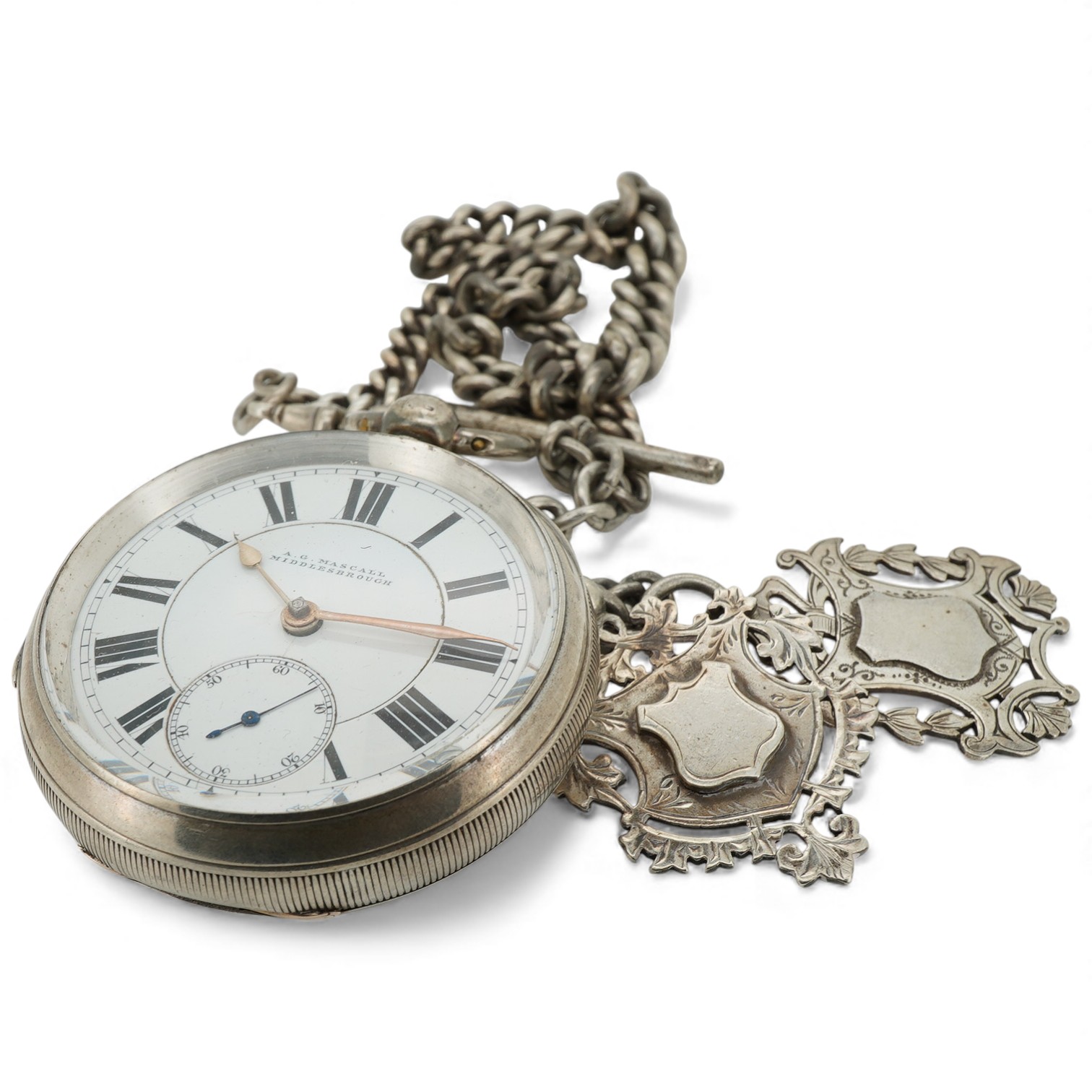 Lot 926 , A late Victorian silver open faced keywind pocket watch, by A.G. Maskell of Middlesborough, case diameter 52mm, on a silver curb link albert, hung with two silver medallions.