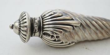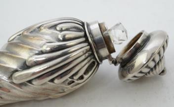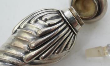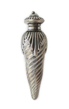 Lot 51 , A late Victorian silver scent flask, of spiral tear drop form, with hinged cover and glass stopper