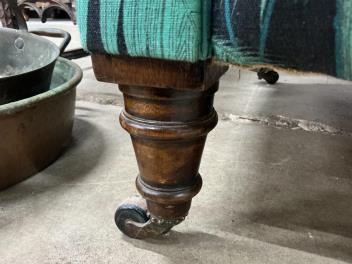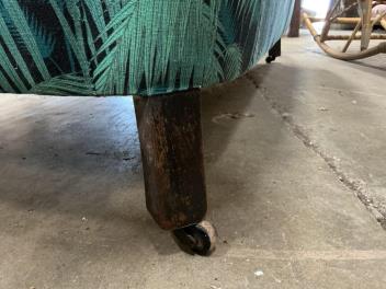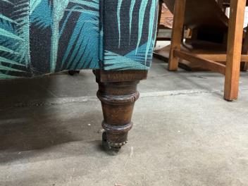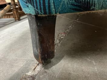 Minor chips + losses to the legs, consistent with age + usage. Upholstery is faded but in good condition, no rips or stains or repairs