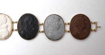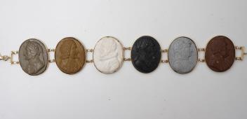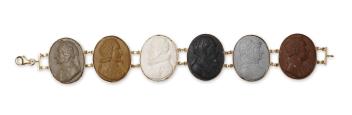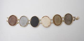 A lava cameo bracelet, composed of oval lava cameos depicting poets and writers including Dante Alighieri and Cicero in profile, mounted in gold, length 20cm, clasp stamped 750