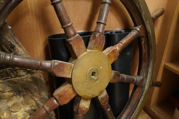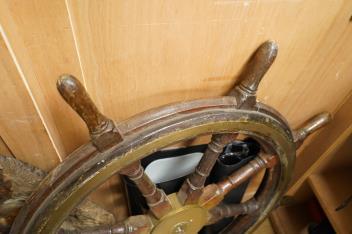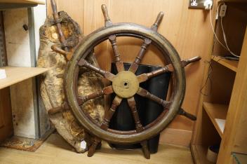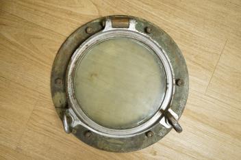 Lot 1628 , A mahogany ships wheel, diameter 80cm, and a brass and chrome porthole, diameter 39cm, by repute off HMS Uganda