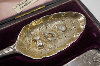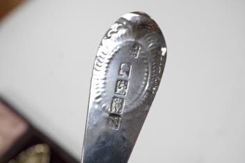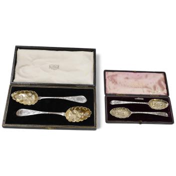 Lot 839 , A matched pair of George III silver berry spoons, Dublin, 1808/9, one maker Kelly, the other John Power, 21.5cm, in later fitted case, together with a cased pair of George III Old English pattern berry spoons, London, 17