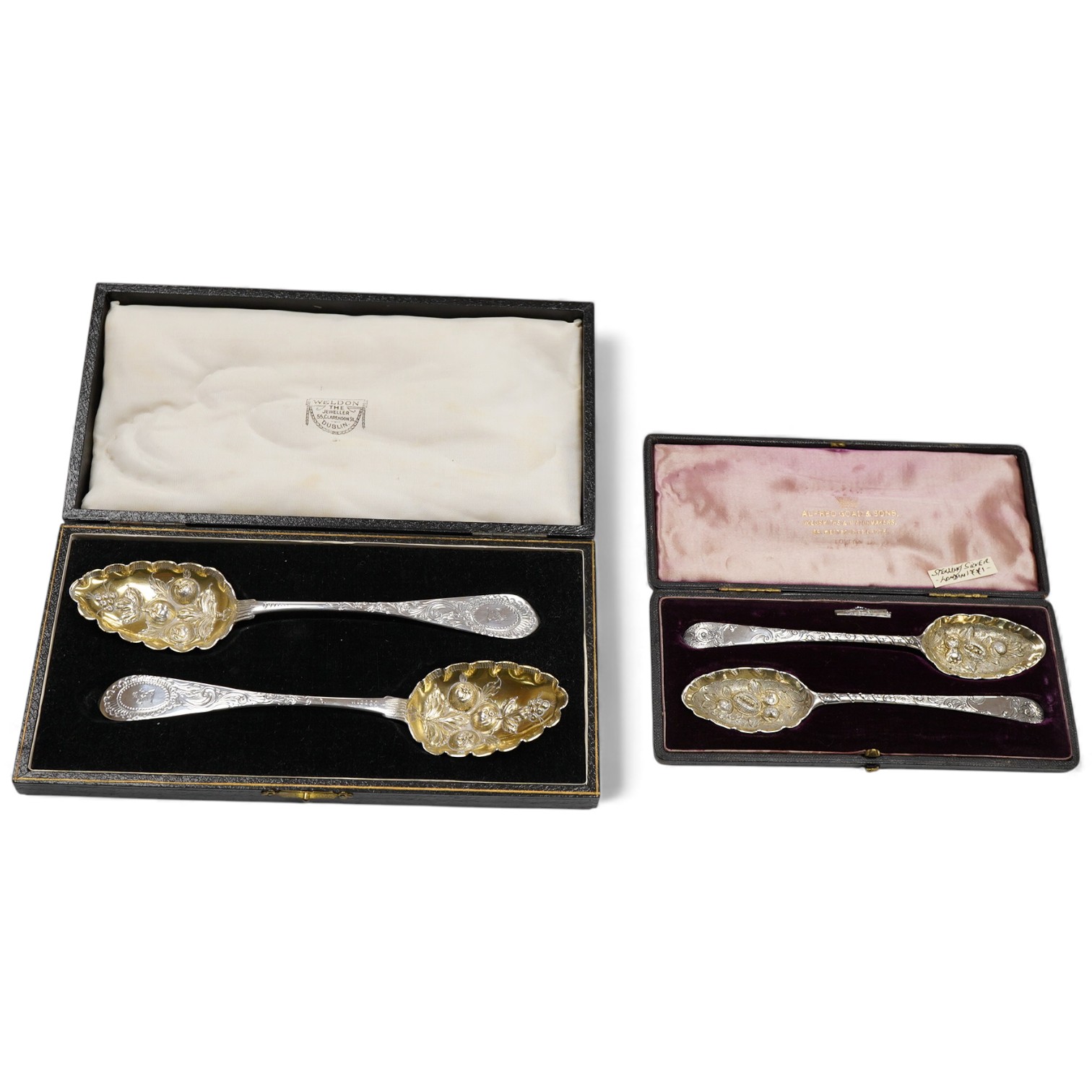 A matched pair of George III silver berry spoons, Dublin, 1808/9, one maker Kelly, the other John Power, 21.5cm, in later fitted case, together with a cased pair of George III Old English pattern berry spoons, London, 17