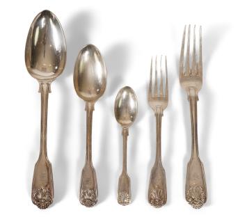 A matched part canteen of mainly 19th century silver double struck fiddle, thread and shell pattern flatware for twelve, comprising twelve table/serving spoons, William Theobalds, London, 1834(7) and Lias Brothers, London, 1852(5), twelve table forks, William Theobalds, London, 1834(9), Lias Brothers, London, 1852(2) and George Adams, London, 1864(1), twelve dessert forks, William Theobalds, London, 1834(9) and George Adams, London, 1864(3), twelve dessert spoons, William Theobalds, London, 1834(8) and Lias Brothers, London, 1852 and twelve teaspoons, John Round, Sheffield, 1902, all with engraved initial, 123.8oz.