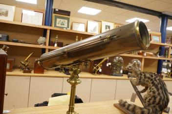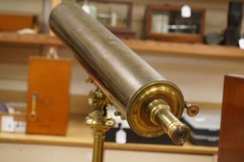 Lot 273 , A mid 18th century brass compound monocular 4 inch diameter Gregorian reflector telescope, length 25inch, [parts of focusing mechanism modern, mirrors made in 1981 by Tony Jenner]