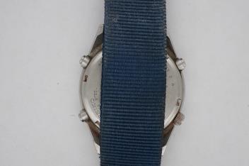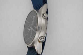 A mid 1980's stainless steel Seiko RAF military issue Generation 1 quartz chronograph wrist watch, with black dial and three subsidiary dials, the case back numbered 6645-99 7683056, with broad arrow and 34441/86, movement 7A28A, on a blue fabric strap, np box or papers.