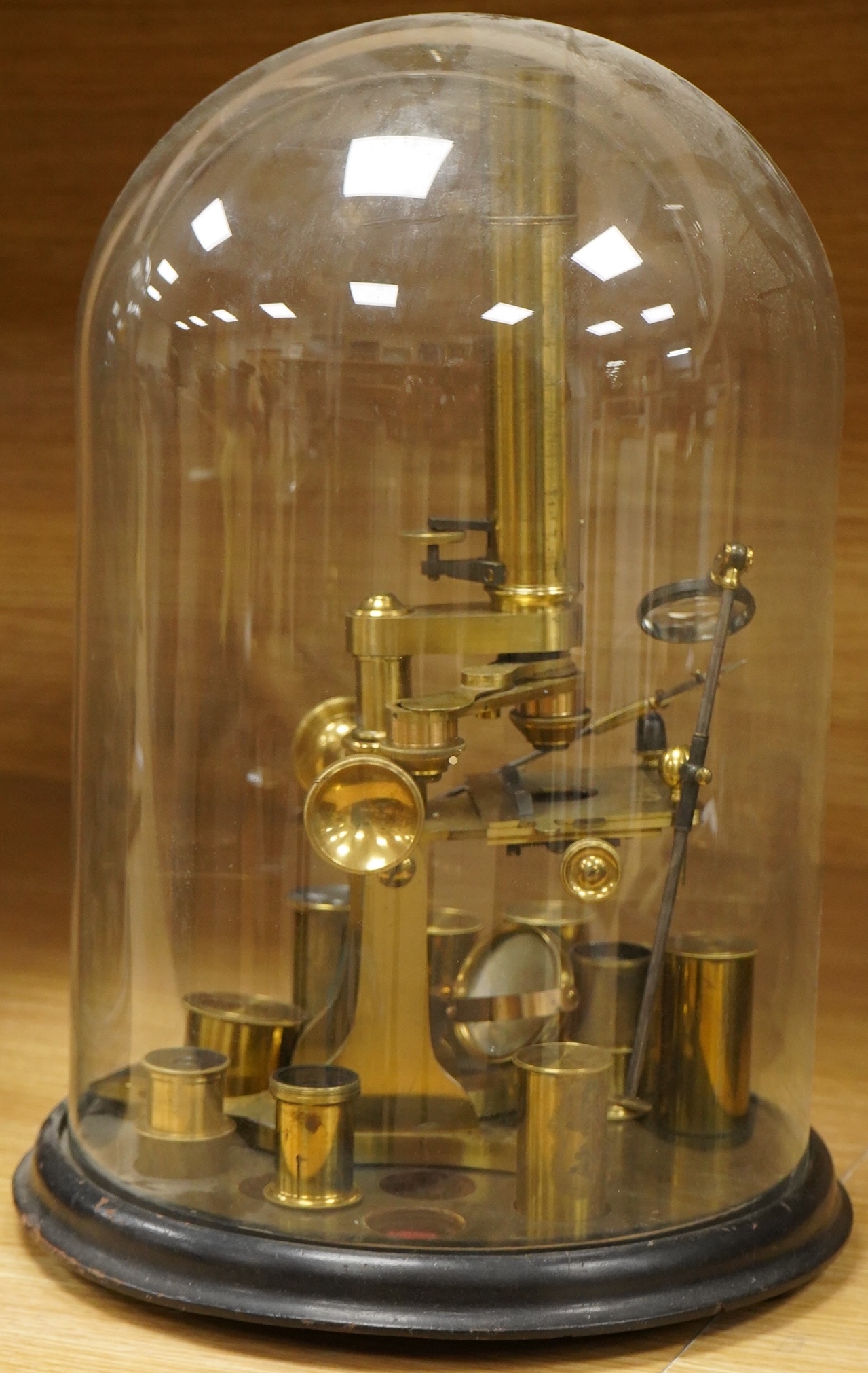 A mid 19th century brass monocular microscope, unsigned, with five objectives and three eyepieces, together with a Lieberkühn, a dark spot substage condenser, and a pair of Nicols prisms