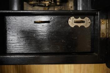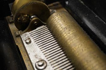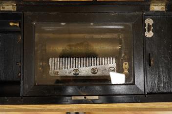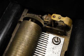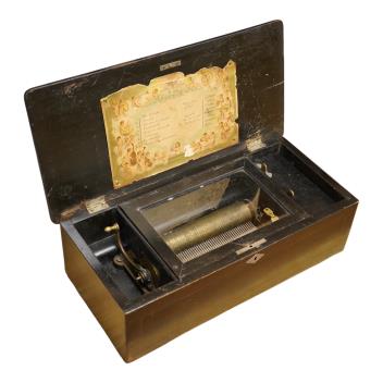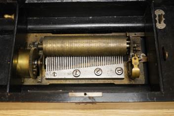 Lot 351 , A mid-19th century inlaid and ebonised rosewood Swiss cylinder music box playing eight airs, card label to the inside of the lid listing the airs, complete with all teeth to the comb, cylinder 15.3cm long, the case; 43cm