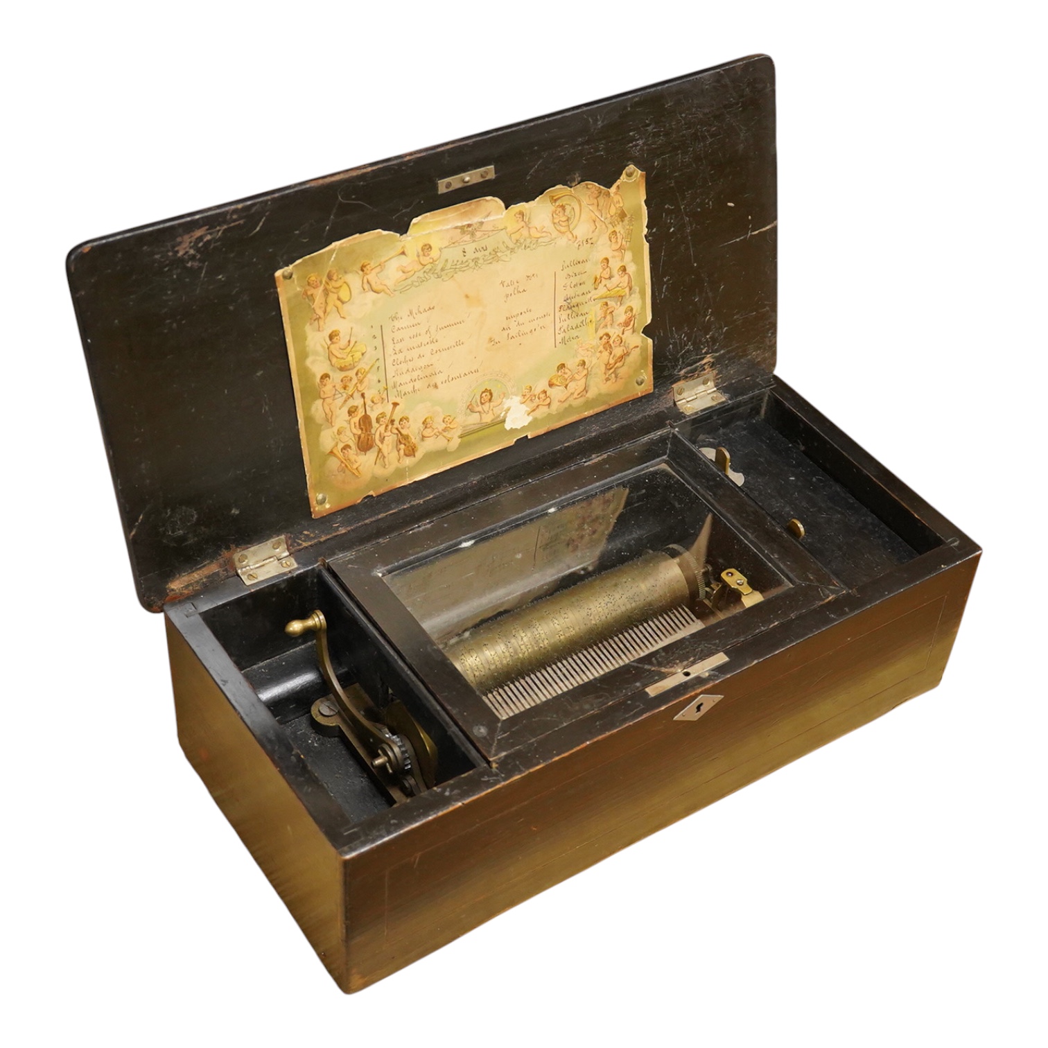 A mid-19th century inlaid and ebonised rosewood Swiss cylinder music box playing eight airs, card label to the inside of the lid listing the airs, complete with all teeth to the comb, cylinder 15.3cm long, the case; 43cm wide, 13.5cm high, 21cm deep