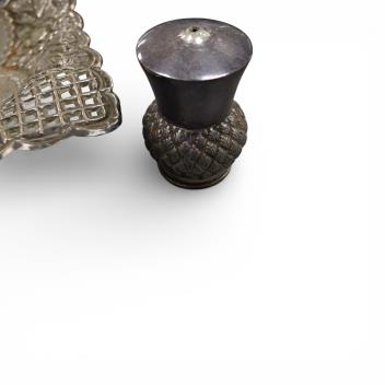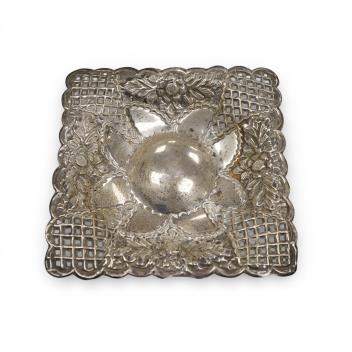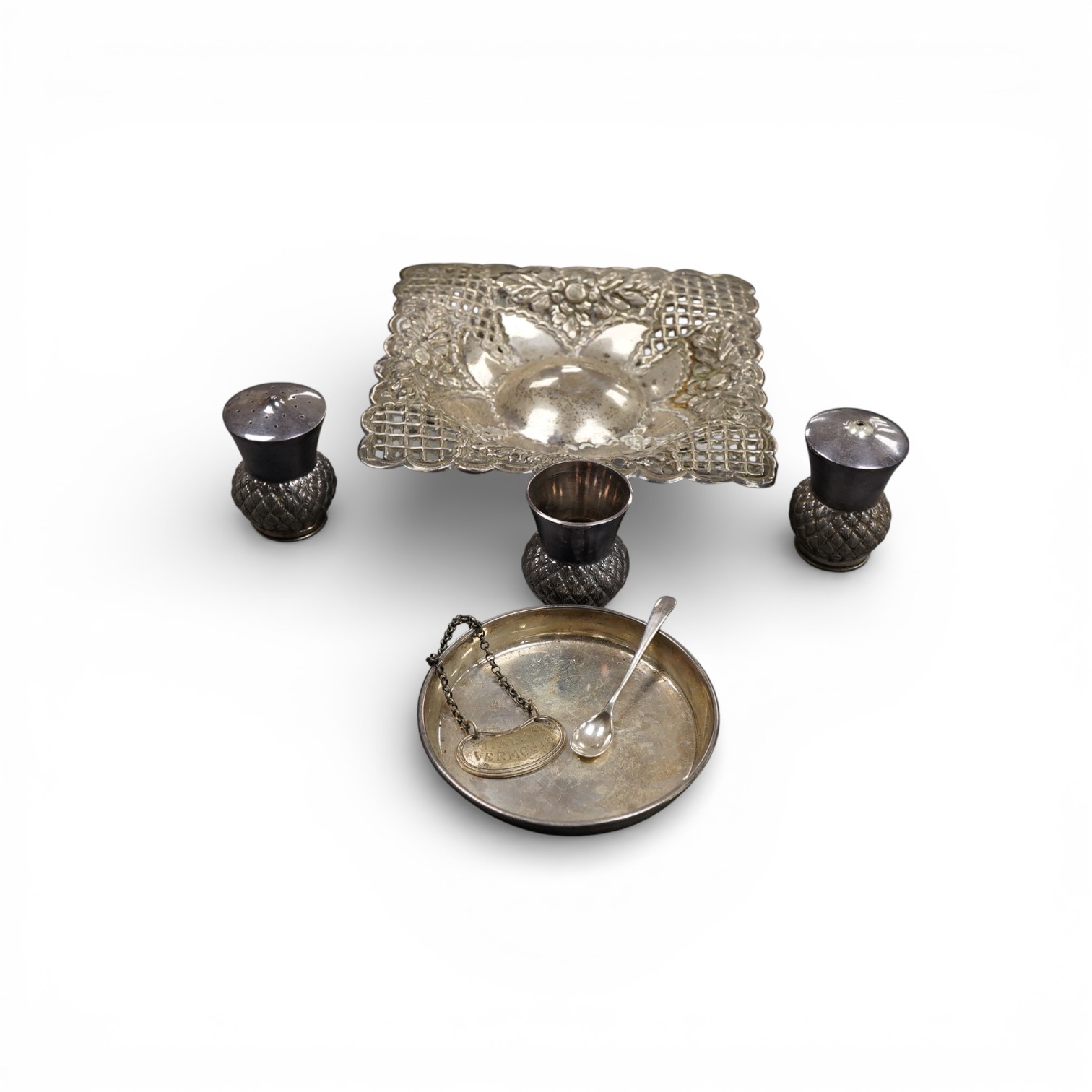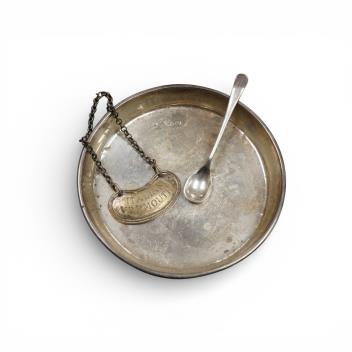 Lot 862 , A mid 20th century Egyptian pieced white metal bowl, on four splayed feet, 15.7cm, together with a small George V silver dish, three E.P.B.M condiments, plated spoon and wine label.