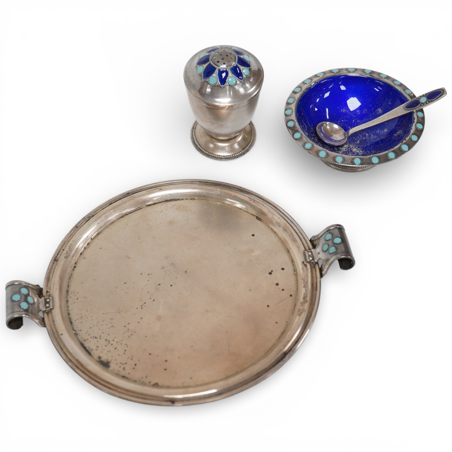 A mid 20th century Soviet Union 875 standard white metal and enamel two handled condiment tray, diameter 11.4cm, together with a similar 916 standard white metal and enamel salt with spoon and pepperette.