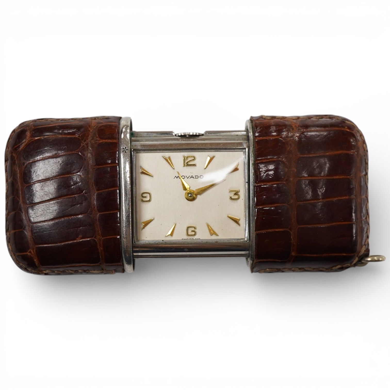 Lot 1908 , A mid 20th century leather mounted steel Movado travelling watch, with arrow head and quarterly Arabic numerals, 40mm.