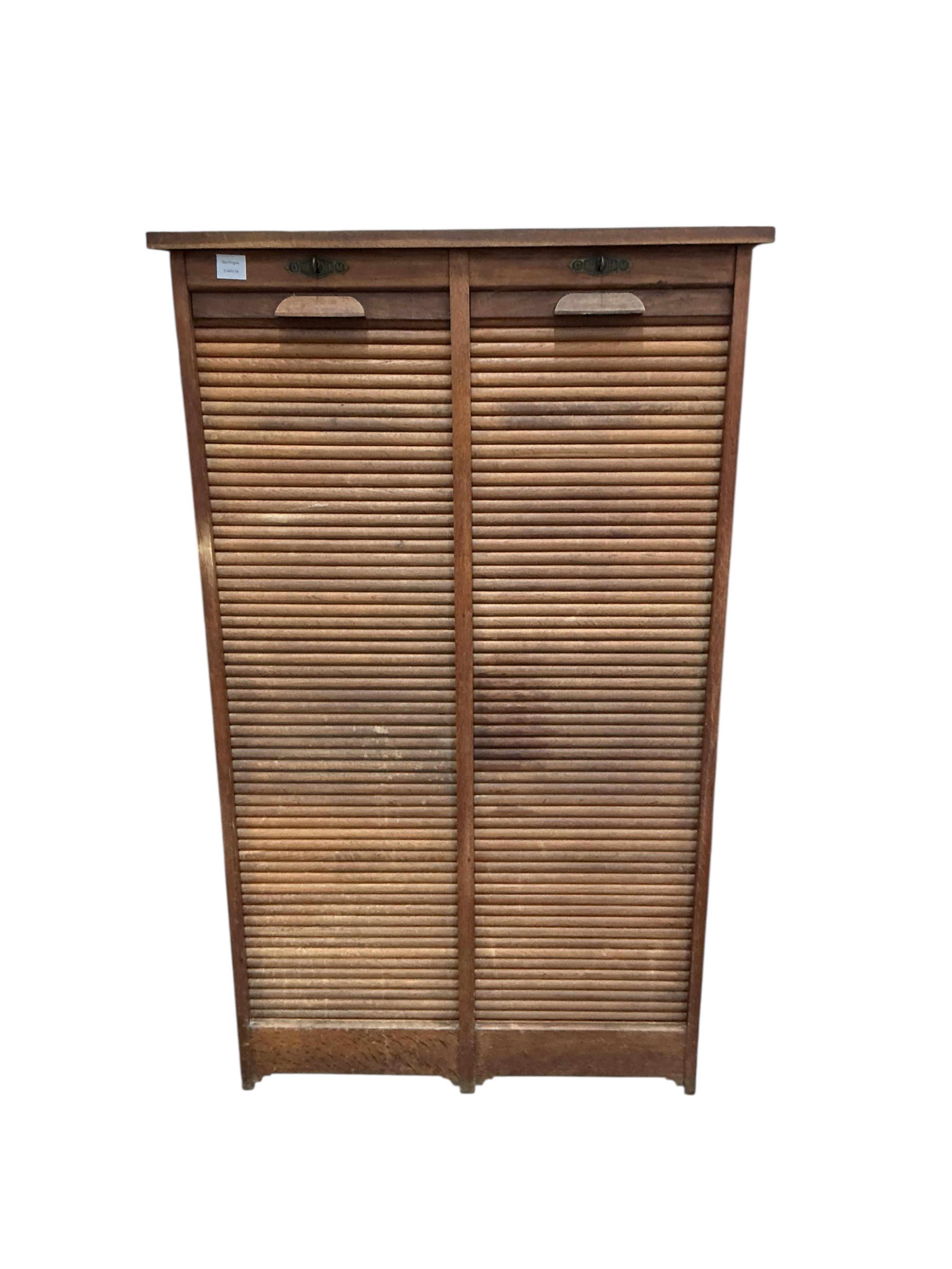 A mid 20th century oak double tambour filing cabinet, width 85cm, depth 37cm, height 144cm