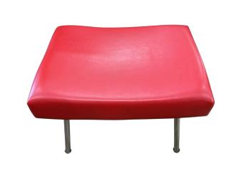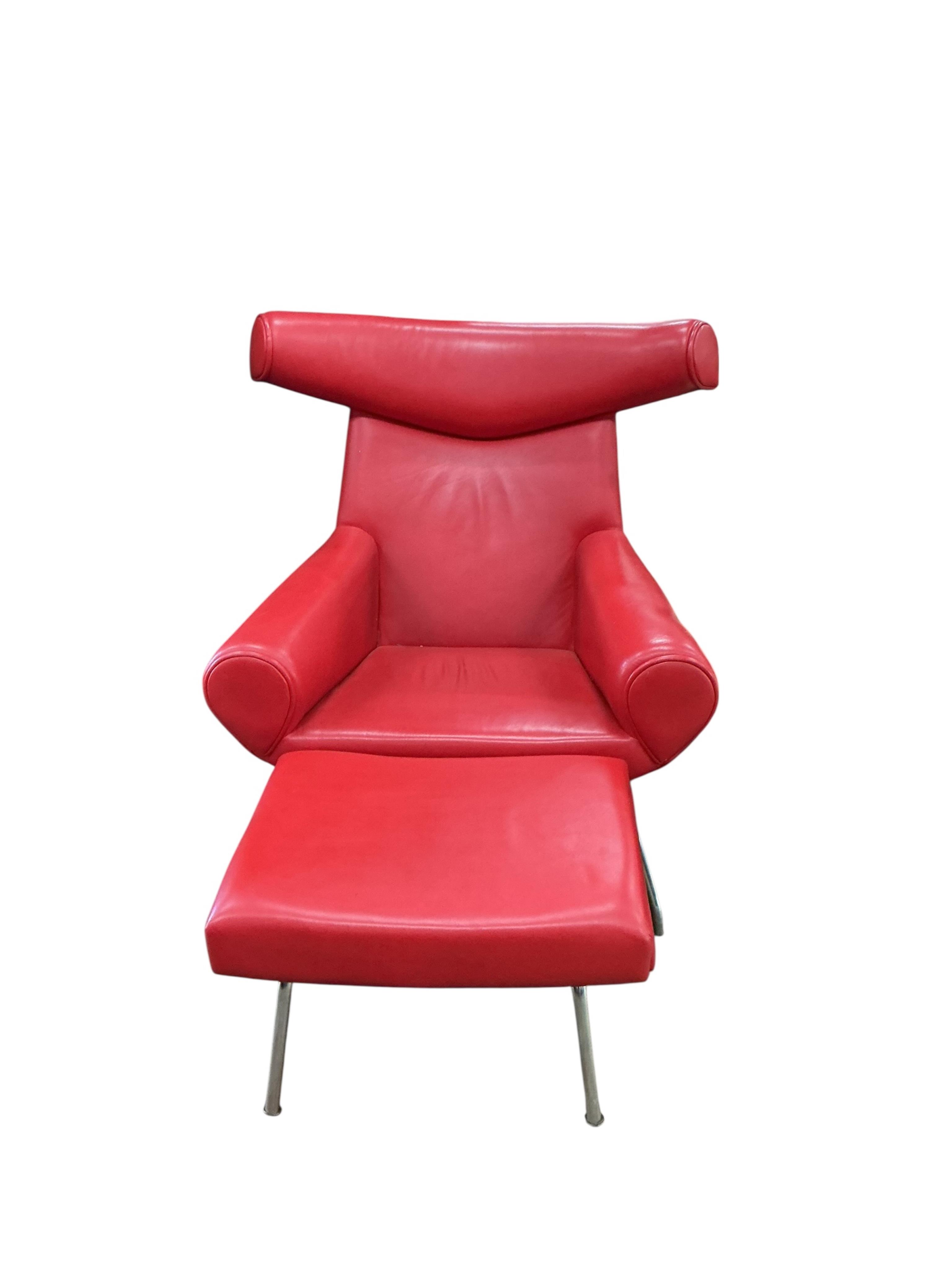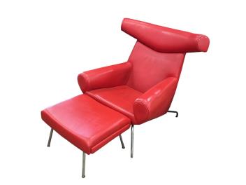 A mid century 'ox' style chair, width 98cm, depth 95cm, height 101cm and footstool