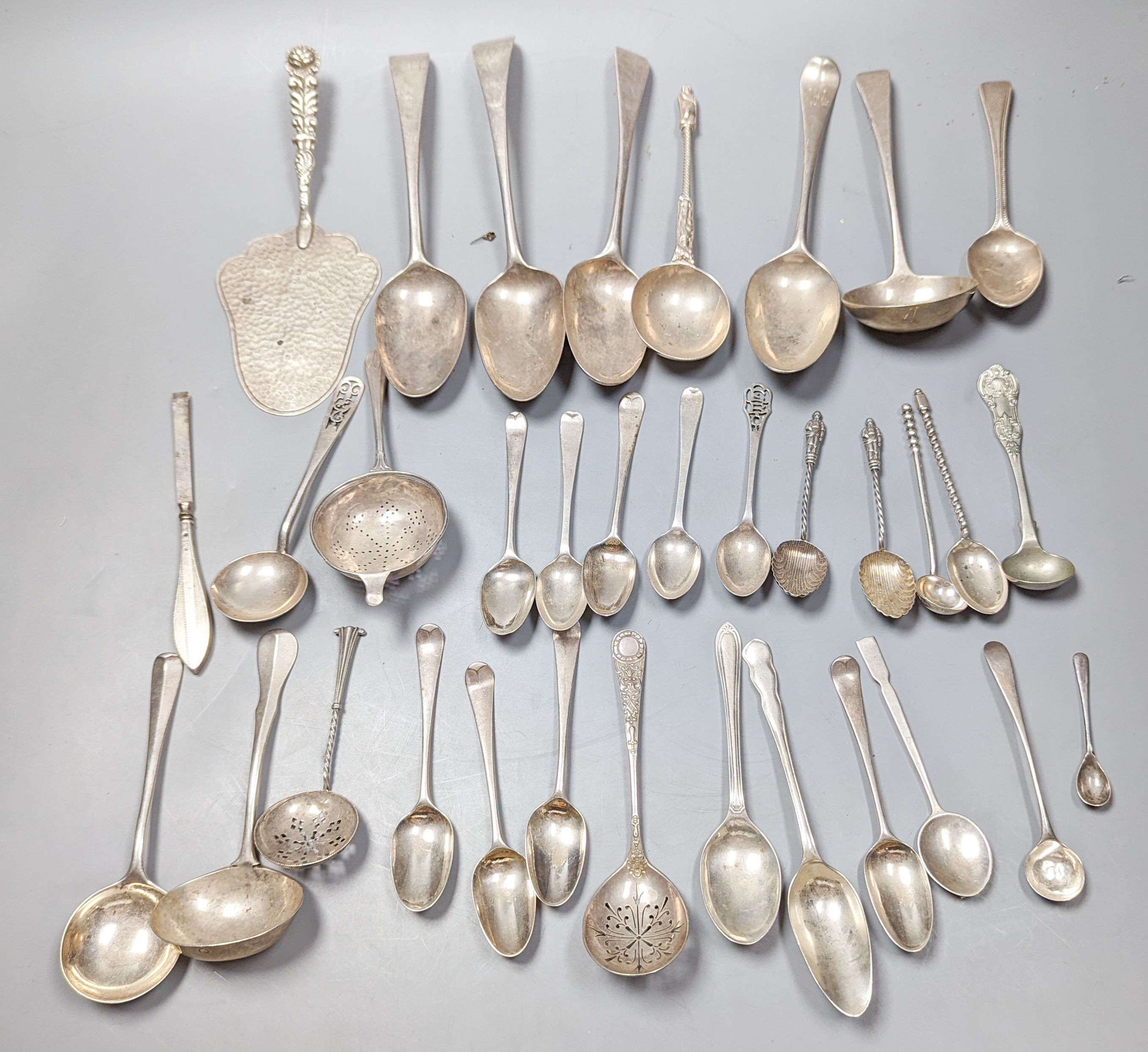 A mixed quantity of 18th, 19th and 20th century silver flatware, including tablespoons, teaspoons, sauce ladles, a 900 standard cake slice, two plated spoons and a nail implement,