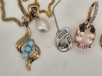 Lot 904 , A modern 10k white metal and diamond chip set scroll pendant, 12mm, on a 10k white metal chain, (knotted with a 375 chain), together with three other modern 9ct and gem set pendants, including cultured pearl, all with 9c