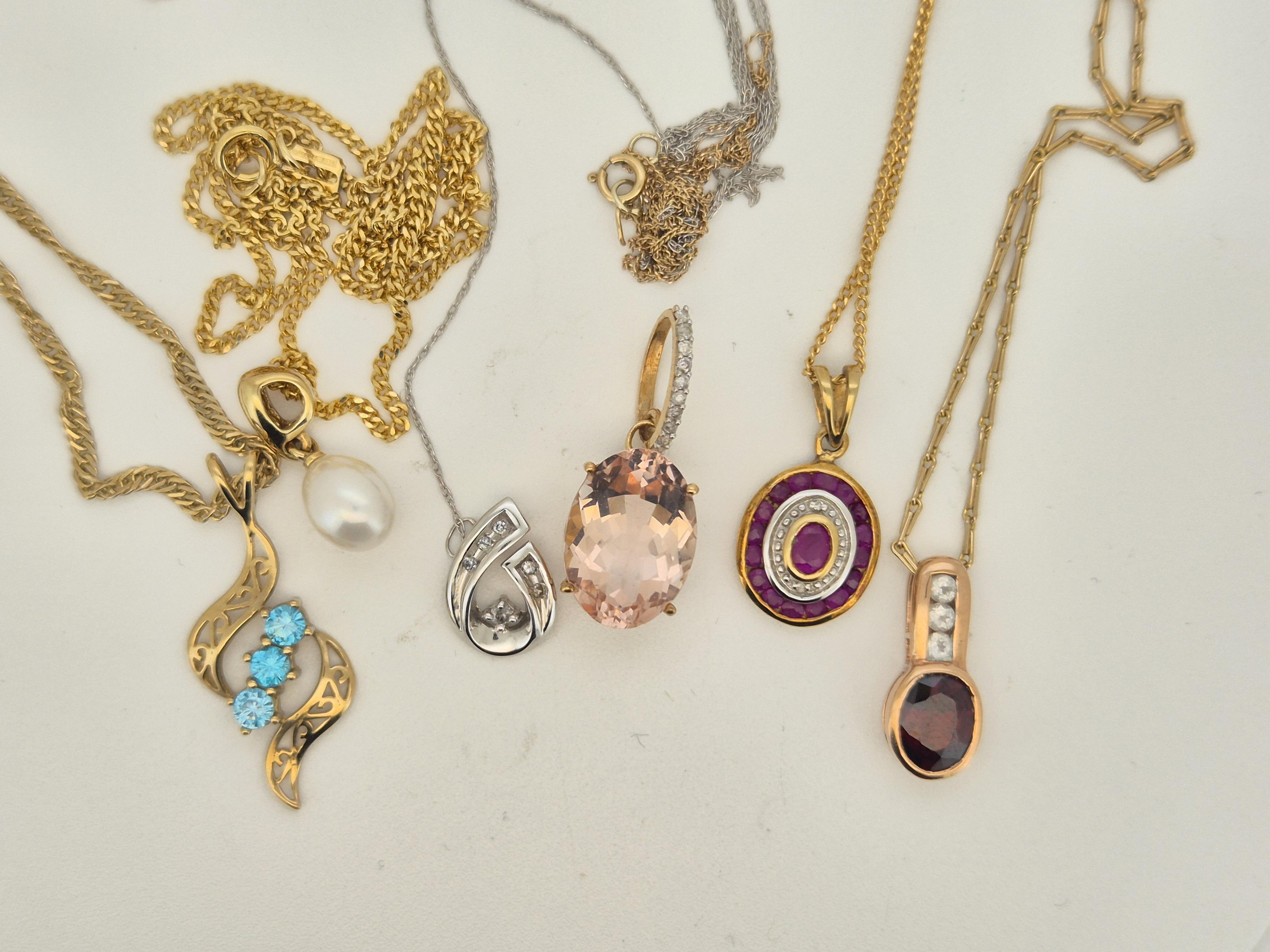 A modern 10k white metal and diamond chip set scroll pendant, 12mm, on a 10k white metal chain, (knotted with a 375 chain), together with three other modern 9ct and gem set pendants, including cultured pearl, all with 9ct gold chains, one other 9kt chain and two other unmarked yellow metal and gem set pendants, gross weight 17.3 grams.