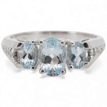 Lot 907 , A modern 10k white metal and three stone oval cut aquamarine ring, with six stone diamond chip set shoulders, size N, gross weight 2.7 grams.
