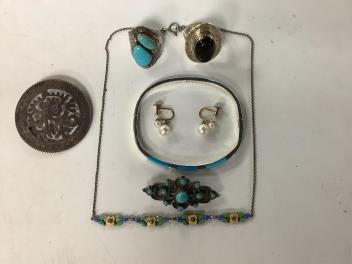 Lot 927 , A modern Mexican silver and blue enamel hinged bangle, together with a white metal (stamped silver) and turquoise cluster set brooch, a white metal and two stone turquoise set ring, a 925 and cabochon set ring, a Mexican