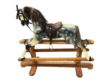 A modern dapple grey rocking horse, unsigned, on a pine base, height to the top of the head 109cm, overall length 136cm