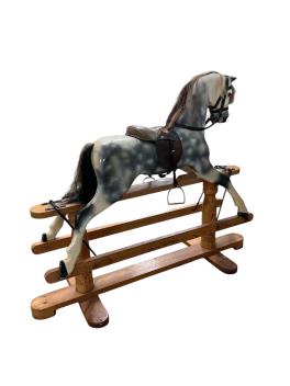 Lot 405 , A modern dapple grey rocking horse, unsigned, on a pine base, height to the top of the head 109cm, overall length 136cm