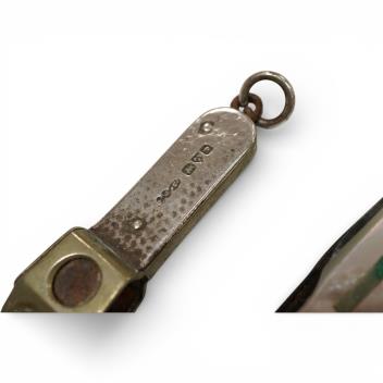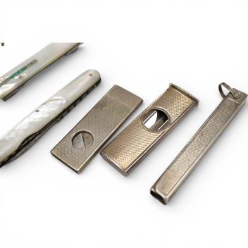 Lot 828 , A modern engine turned silver cigar cutter, 52mm, one other early 20th century silver mounted cigar cutter by Sampson Mordan & Co, one other white metal mounted cigar cutter, two mother of pearl penknives and an engine t