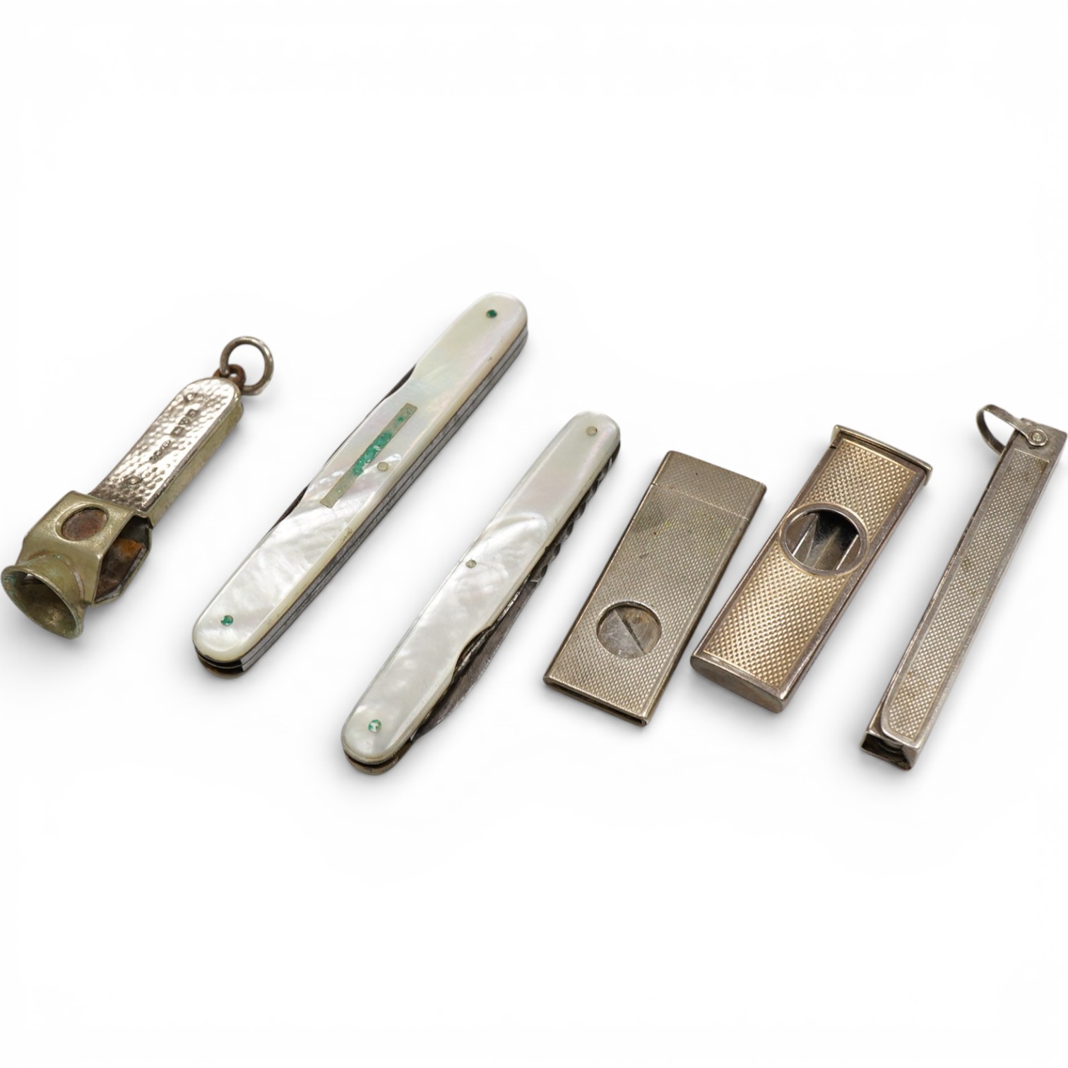 A modern engine turned silver cigar cutter, 52mm, one other early 20th century silver mounted cigar cutter by Sampson Mordan & Co, one other white metal mounted cigar cutter, two mother of pearl penknives and an engine turned 935 white metal mounted multi tooled implement.