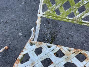 A mosaic topped demi-lune wrought iron garden table, width 96cm and a circular metal folding table with two chairs (requiring new bolts)