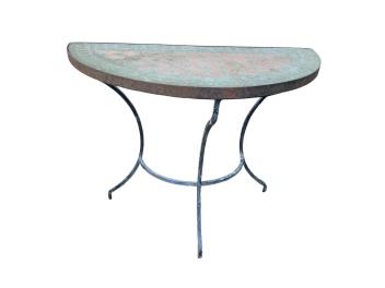 Lot 2161 , A mosaic topped demi-lune wrought iron garden table, width 96cm and a circular metal folding table with two chairs (requiring new bolts)