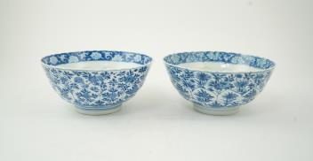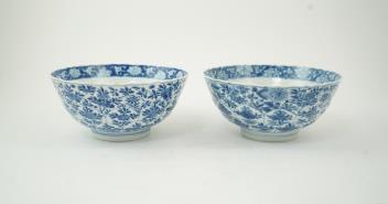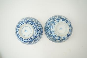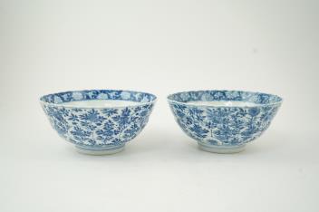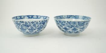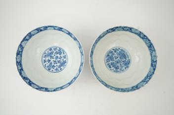 Lot 80 , A near pair of Chinese blue and white lotus flower moulded bowls, Kangxi period