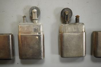 Lot 1853 , A near pair of George VI silver mounted lighters, each inscribed 'The Howitt Lighter', by Dudley Russell Howitt, Sheffield, 1946, (one engine turned), 58mm.