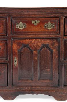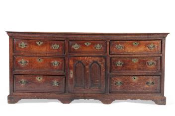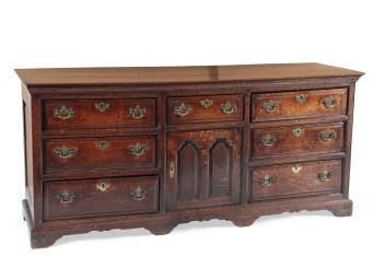 fitted with an arrangement of seven graduated drawers around a central twin panelled cupboard, on bracket feet, 198cm wide, 59cm deep, 89cm high