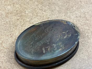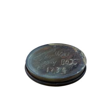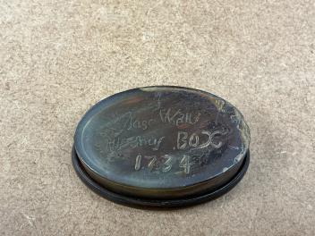 Lot 1473 , A oval tortoiseshell snuff box with stylised decoration, incised dated 1734 to the base, 6.5cm wide