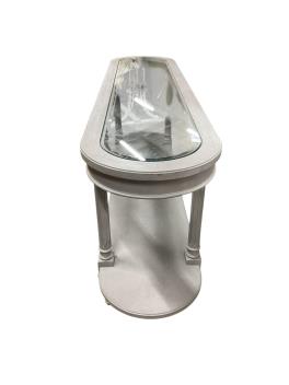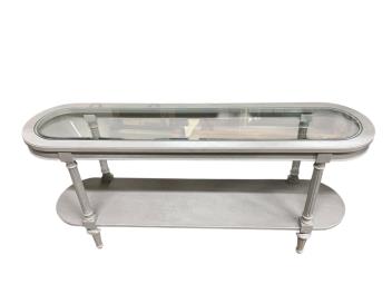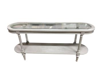 A painted two tier glass top console table, width 146cm, depth 35cm, height 67cm