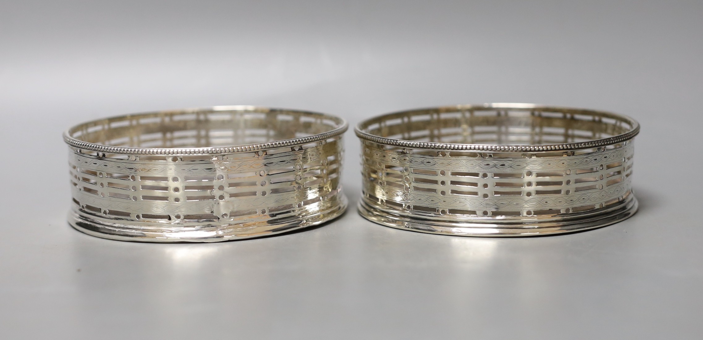 A pair of 19th century pierced silver wine coasters, marks rubbed, diameter 12.1cm (a.f.).