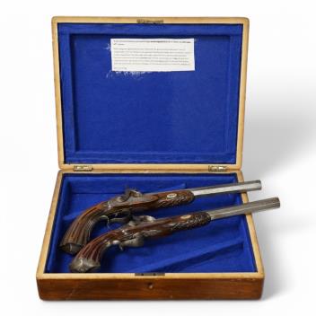 Lot 275 , A pair of 40 bore percussion target pistols by Devisme of Paris, octagonal barrels cut with multi-groove rifling, engraved and signed locks, steel furniture ensuite, fluted walnut butts, half stocked, with gold inlaid nu