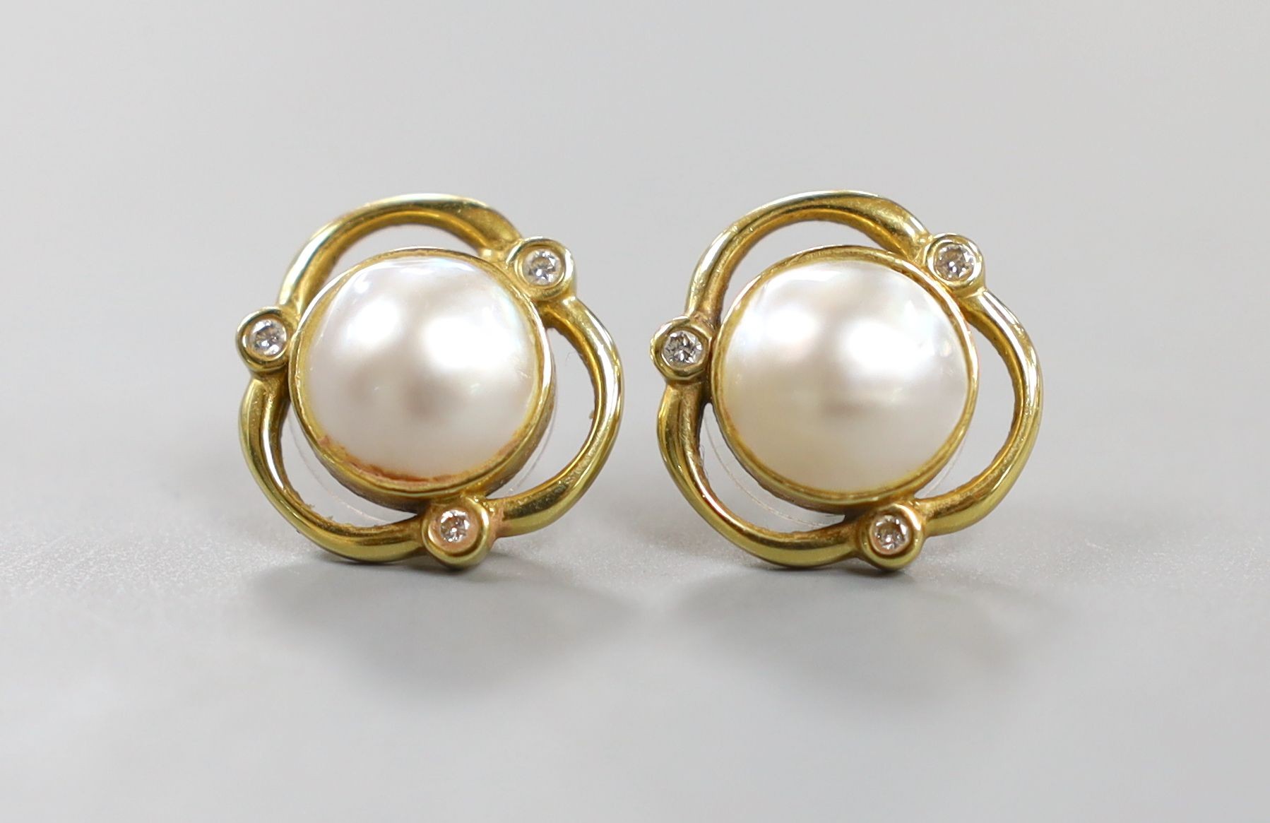 A pair of 750 yellow metal, mabe pearl and diamond chip set earrings, 16mm, gross weight 7 grams,