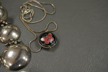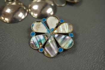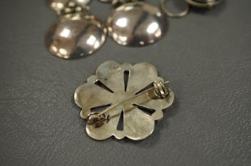 Lot 929 , A pair of 925 graduated triple disc drop ear clips, 66mm, together with a Mexican white metal and paua shell brooch(a.f.) and an enamelled pendant decorated with a butterfly, on an Italian 925 chain.