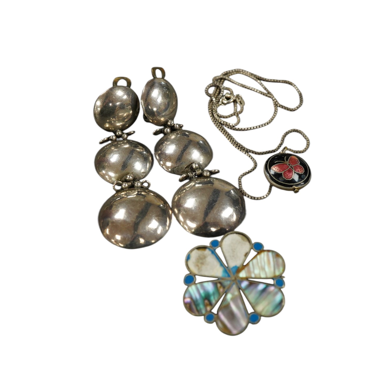 A pair of 925 graduated triple disc drop ear clips, 66mm, together with a Mexican white metal and paua shell brooch(a.f.) and an enamelled pendant decorated with a butterfly, on an Italian 925 chain.