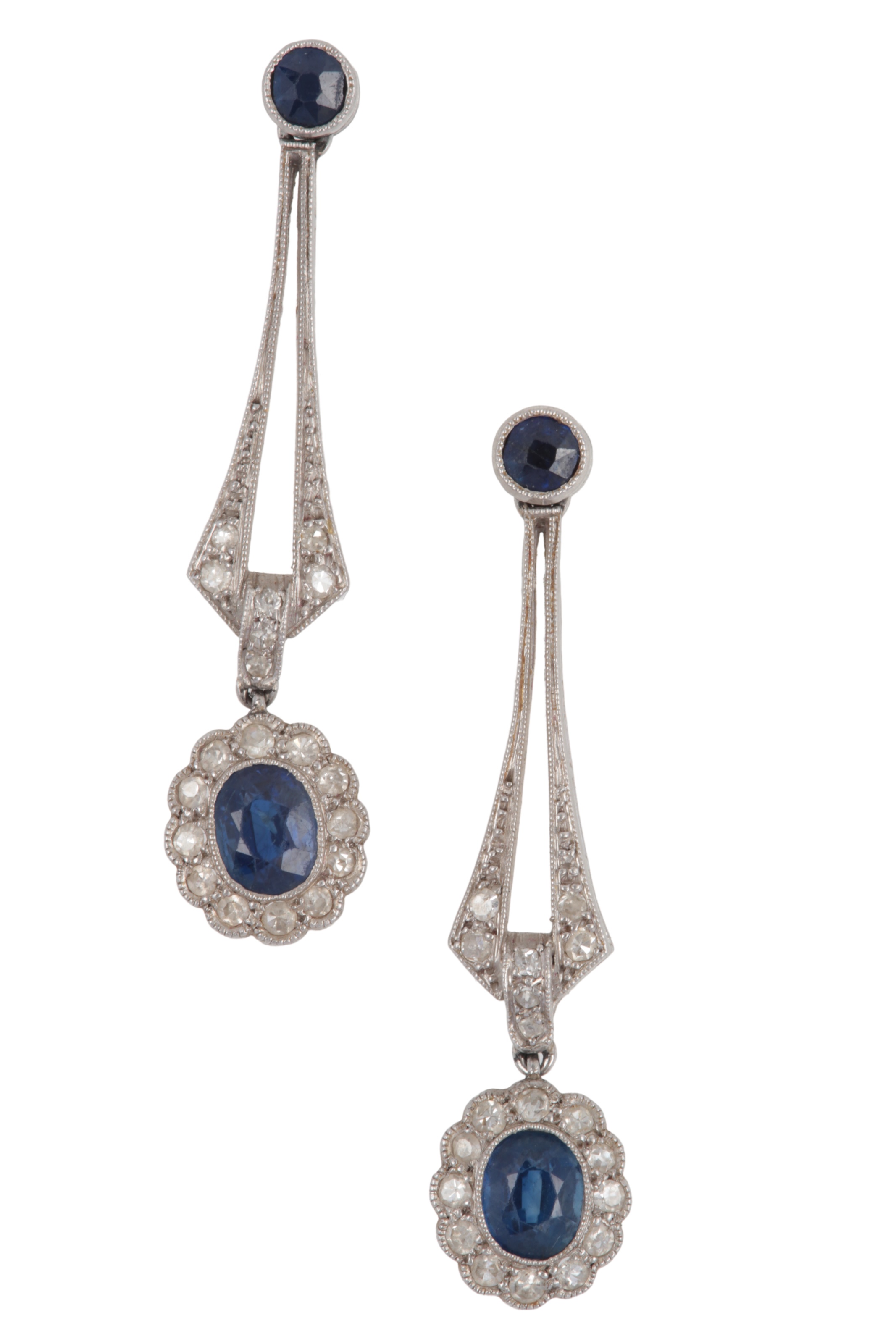A pair of Art Deco sapphire and diamond drop earrings, early 20th century, each composed of an oval sapphire within a border of single-cut diamonds, suspended by an elongated geometric link from a circular-cut sapphire surmount, set in platinum with millegrain borders, length 4cm each, post fittings, combined gross weight approximately 5.5 grams