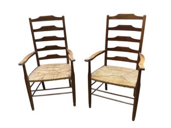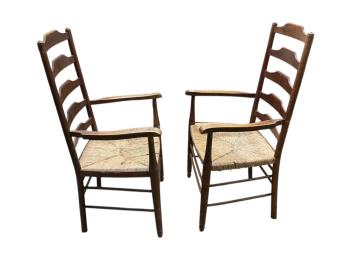 Lot 1085 , A pair of Arts & Crafts oak ladderback rush seat elbow chairs, width 62cm, depth 47cm, height 108cm