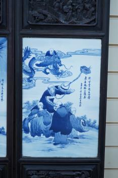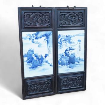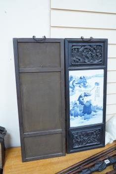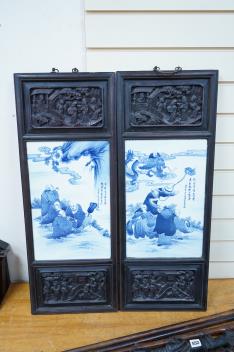 Lot 551 , A pair of Chinese blue and white porcelain plaques, inset carved wood frames, 84cm x 32cm