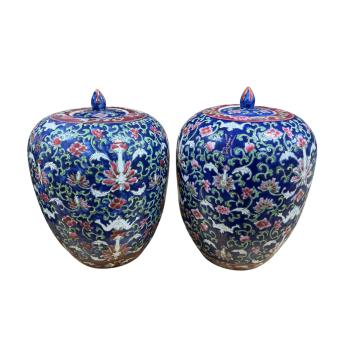 A pair of Chinese blue ground famille rose ovoid jars and covers, height(s) 29cm.