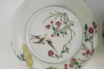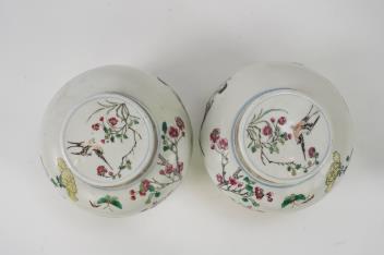 A pair of Chinese famille rose jars and covers, Kangxi mark but late 19th/early 20th century, each painted with two birds amid flowering shrubs and rockwork, 24cm high, one with discoloured restoration