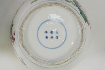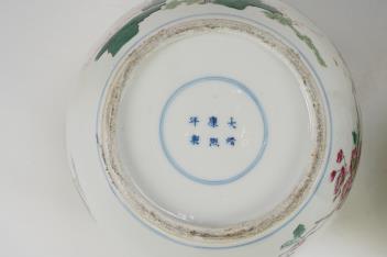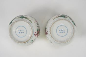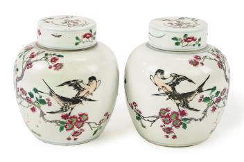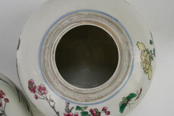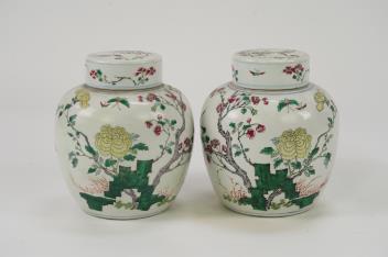 Lot 122 , A pair of Chinese famille rose jars and covers, Kangxi mark but late 19th/early 20th century